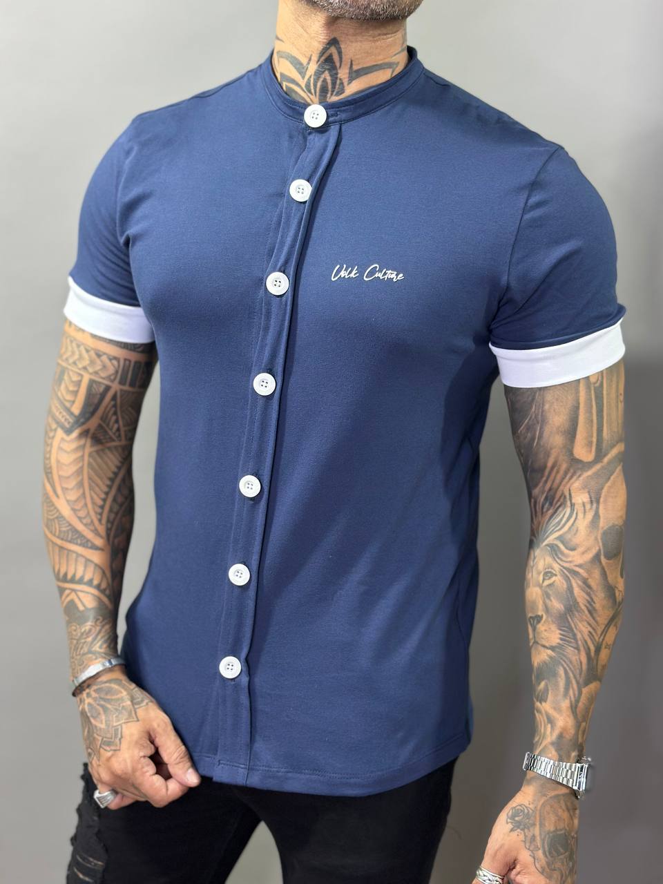 O visual é valorizado pelos botões frontais brancos, que contrastam com o azul profundo da peça, além da gola padre minimalista que reforça o estilo moderno. Os detalhes brancos nas mangas acrescentam identidade visual com um toque esportivo de alto nível.