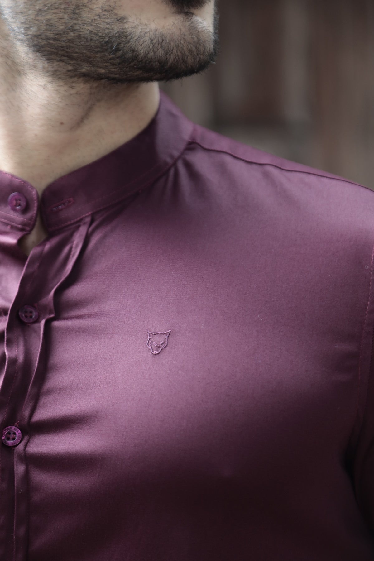 Camisa Manga Curta Social Gola Padre Vinho Algodão Egípcio