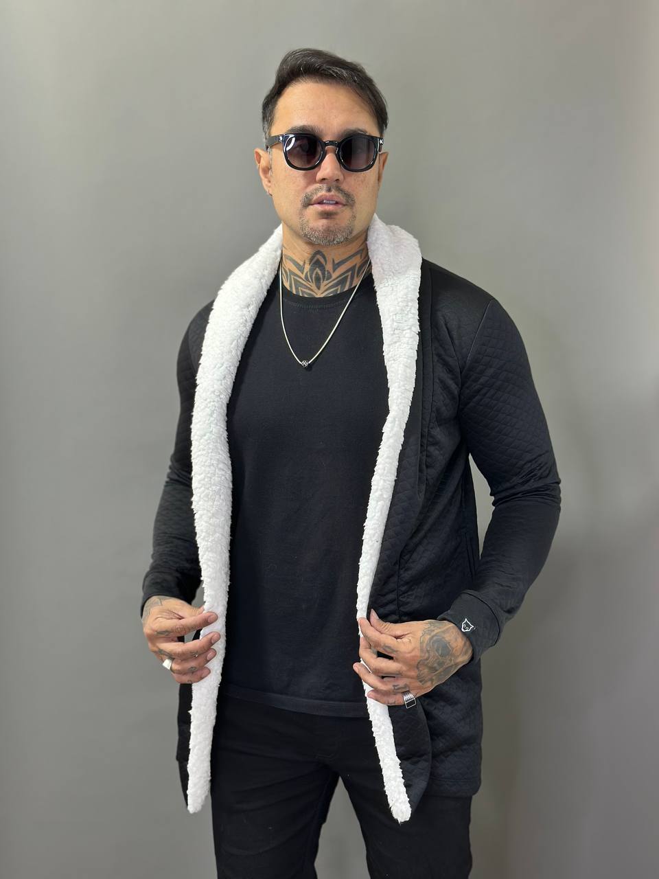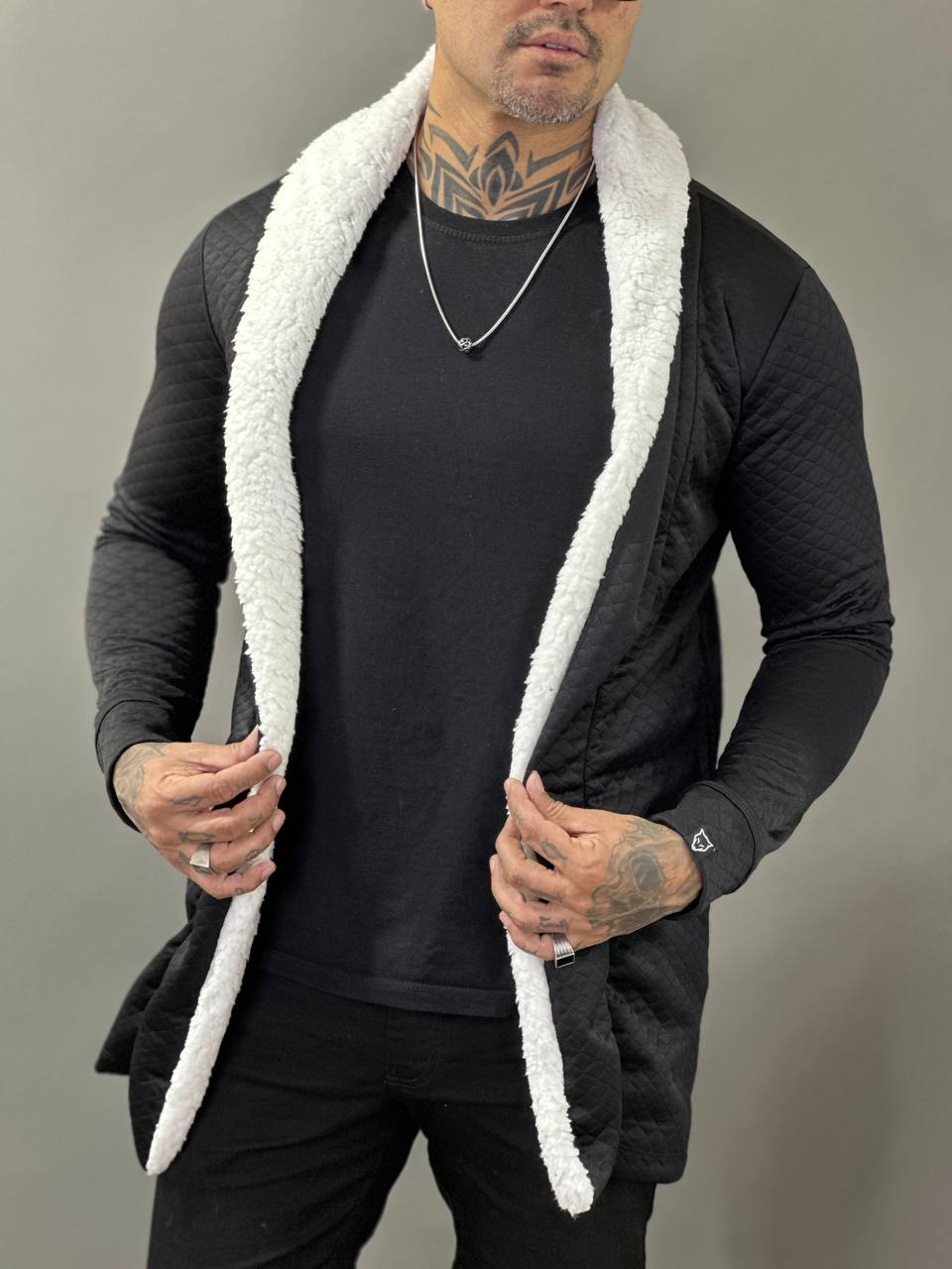 O Sobretudo Everest Matelacê Preto da Volk Culture é a escolha perfeita para quem deseja um visual imponente e versátil nos dias frios. Com acabamento matelacê texturizado e a icônica gola em sherpa branca, essa peça cria um contraste sofisticado e contemporâneo — ideal para compor looks monocromáticos ou urbanos com impacto visual.